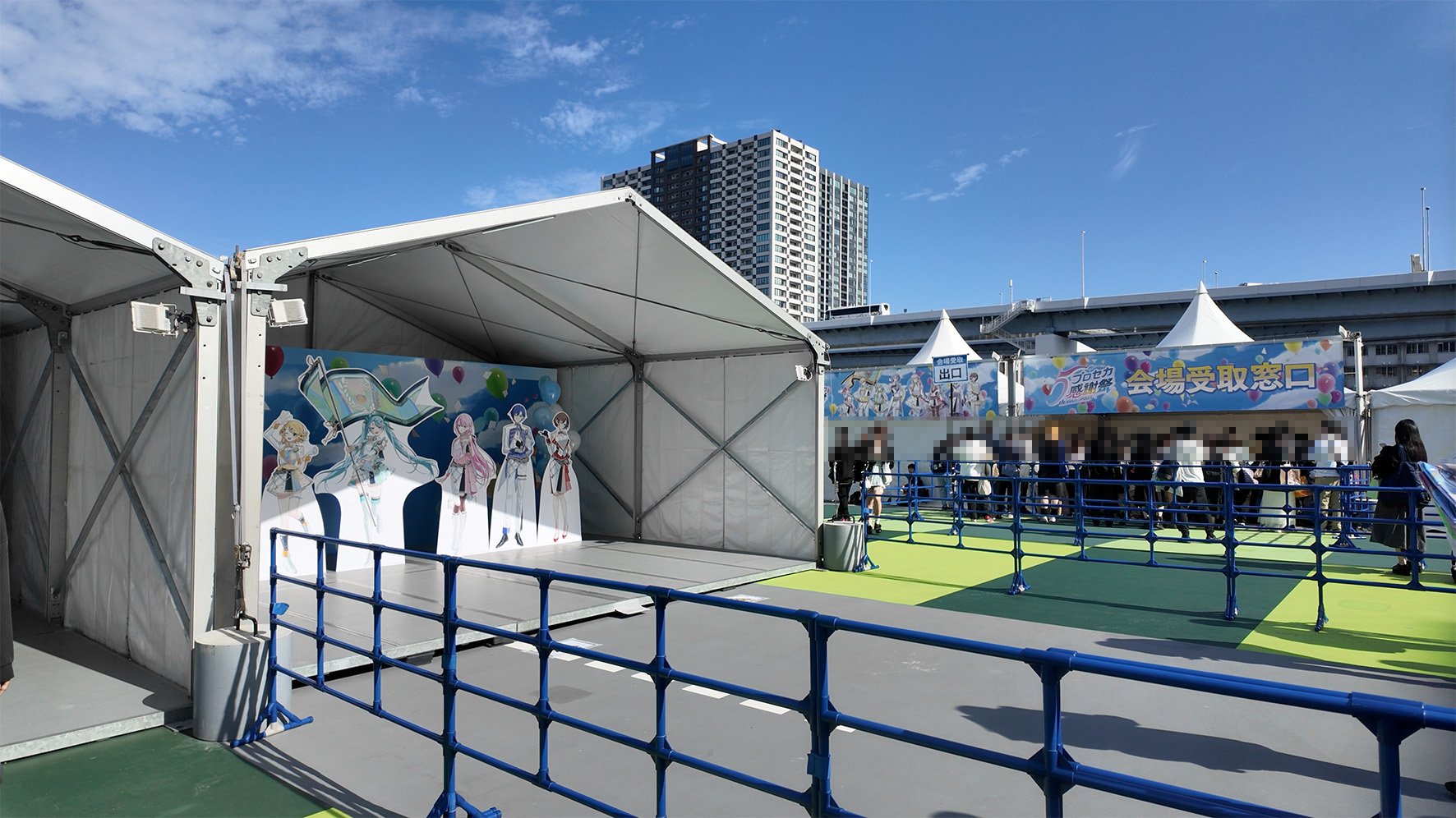 展示エリア中央は5ユニット+バチャシンの等身大パネル展示。ユニットごとに別のテントで列を作る形式。